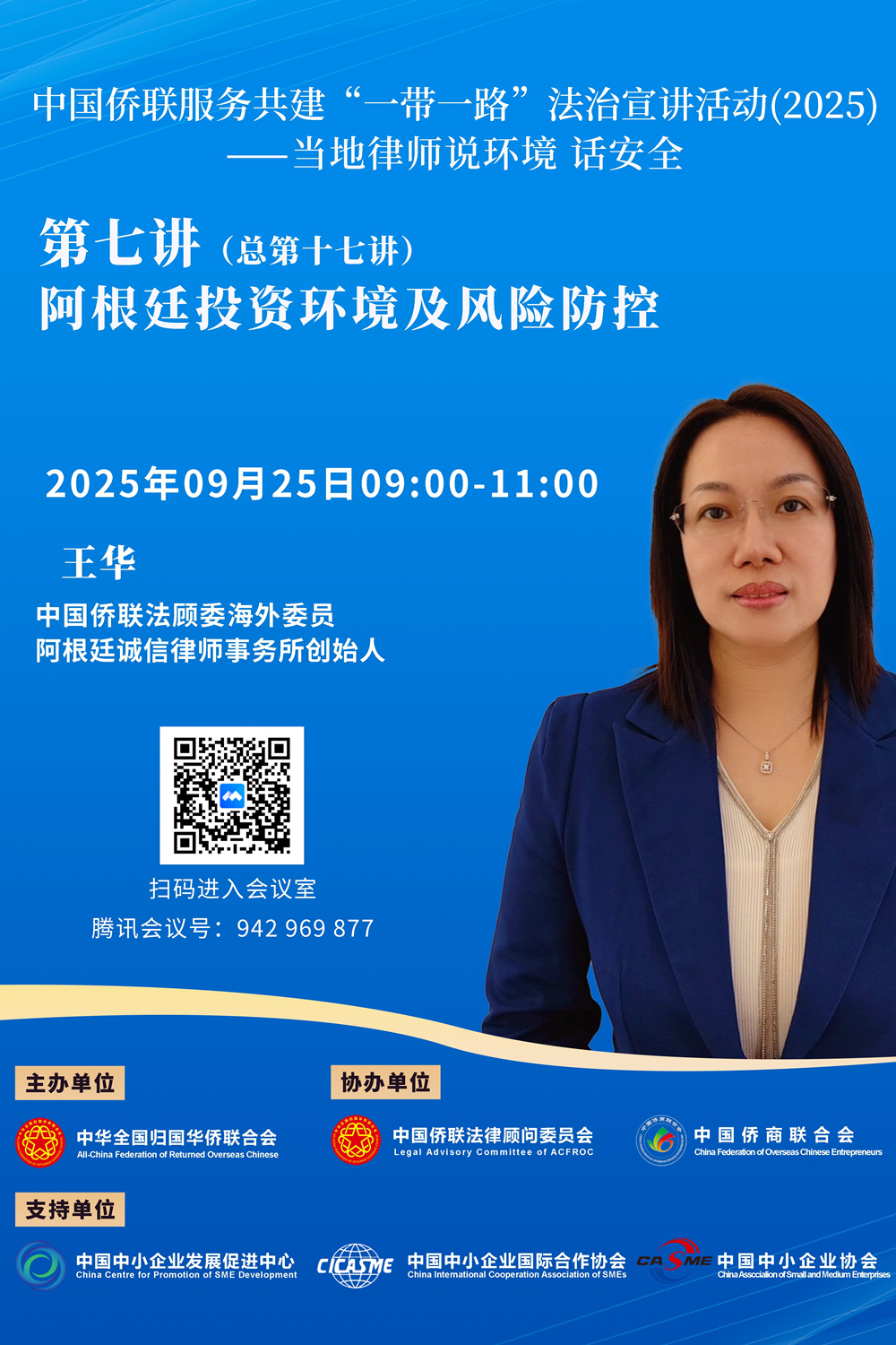 今年第七講(總第十七講)將于2025年9月25日(周四)9:00開播,由中國僑聯(lián)法顧委海外委員阿根廷王華律師主講。王律師畢業(yè)于阿根廷美洲大學(xué),獲得國際貿(mào)易碩士學(xué)位,持有律師執(zhí)照和阿根廷國家公認(rèn)中西文翻譯資格證。王律師專注于公司法、海關(guān)法、國際貿(mào)易和移民法等,近年來在中資企業(yè)投標(biāo)、重組、并購、索賠、公證等方面提供全方位法律服務(wù),助力中資企業(yè)“走出去”。王律師還同時(shí)兼任阿根廷華僑華人婦女聯(lián)合總會會長、中國駐阿根廷大使館領(lǐng)事部法律顧問、阿根廷布宜諾斯艾利斯大學(xué)法學(xué)院特聘教授等職務(wù)。