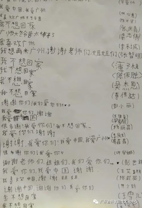 ? ? 營(yíng)員們紛紛表示:這次冬令營(yíng)給他們留下了精彩、深刻而又難忘的記憶,收獲不少,親身感受到了祖國(guó)科技發(fā)展和繁榮昌盛,激發(fā)了深入學(xué)習(xí)和了解中華優(yōu)秀傳統(tǒng)文化的興趣。會(huì)把所學(xué)所見(jiàn)帶回國(guó),分享給親朋好友,讓更多的華裔青少年和同學(xué)了解中國(guó)文化的精髓,做中國(guó)和印尼兩國(guó)友誼的橋梁和紐帶。大家依依不舍,用學(xué)會(huì)的漢字書(shū)寫了“我愛(ài)中國(guó)我愛(ài)廣州”、“我不想回家”表達(dá)情懷。