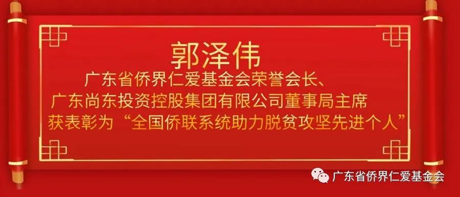 ?? ?? 2021年1月22日,中國僑聯(lián)印發(fā)文《中國僑聯(lián)關(guān)于通報(bào)表彰全國僑聯(lián)系統(tǒng)助力脫貧攻堅(jiān)先進(jìn)集體和先進(jìn)個(gè)人的決定》,總結(jié)僑聯(lián)系統(tǒng)助力脫貧攻堅(jiān)的工作經(jīng)驗(yàn),褒揚(yáng)作出突出貢獻(xiàn)的先進(jìn)集體、先進(jìn)個(gè)人,中國僑聯(lián)決定,對(duì)202個(gè)全國僑聯(lián)系統(tǒng)助力脫貧攻堅(jiān)先進(jìn)集體、102名全國僑聯(lián)系統(tǒng)助力脫貧攻堅(jiān)先進(jìn)個(gè)人進(jìn)行通報(bào)表彰。我會(huì)榮譽(yù)會(huì)長、廣東尚東投資控股集團(tuán)有限公司董事局主席郭澤偉率領(lǐng)的廣東國際華商會(huì)獲評(píng)為“全國僑聯(lián)系統(tǒng)助力脫貧攻堅(jiān)先進(jìn)集體”!“全國僑聯(lián)系統(tǒng)助力脫貧攻堅(jiān)先進(jìn)個(gè)人”;2021年6月9日,郭澤偉先生通過廣東尚東公益基金會(huì),向中山大學(xué)附屬第一醫(yī)院捐贈(zèng)50萬元人民幣,用于支援新冠疫情防控工作,旨在為奮戰(zhàn)在抗疫一線的工作人員提供支持,籍此對(duì)高溫暴雨下醫(yī)護(hù)人員和廣大市民街坊的共同努力下,堅(jiān)決遏制疫情蔓延,全力以赴打贏這場疫情阻擊戰(zhàn),始終和社會(huì)各界攜手并進(jìn),共克時(shí)艱。